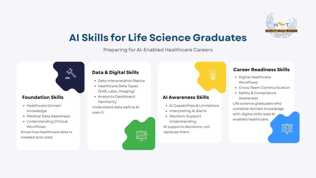 These skills help life science students and early-career professionals move from awareness to practical readiness. Building strong domain understanding alongside data and digital literacy enables professionals to work effectively alongside AI systems and develop sustainable career pathways in evolving healthcare environments.